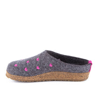 Fall in love with the heart details and premium comfort of the Haflinger Cuoricini clog. The upper features 100% pure wool felt which allows for breathability and durability. Your feet will feel cozy and comfortable in a natural material that keeps the temperature constant whether for indoor or outdoor wear.