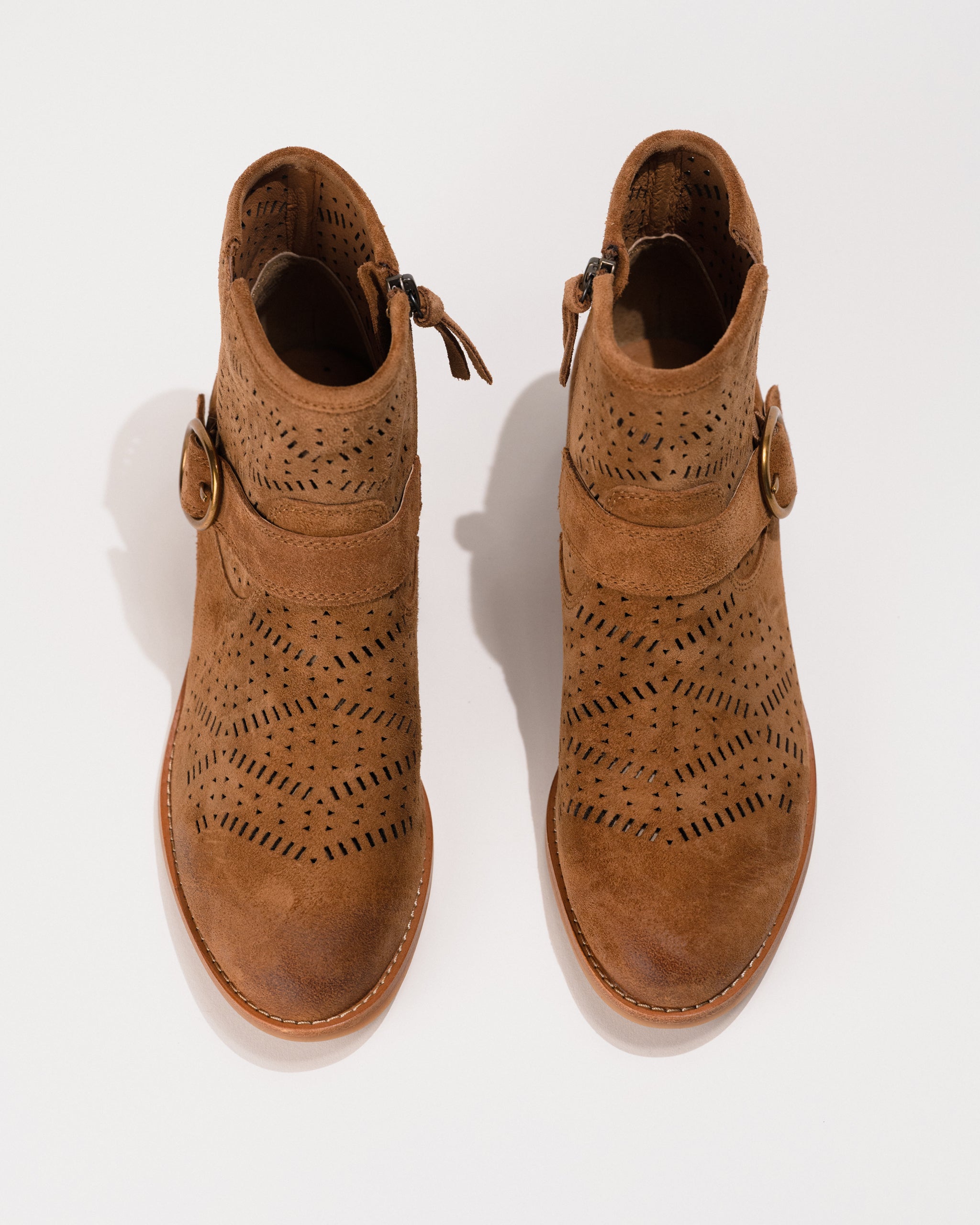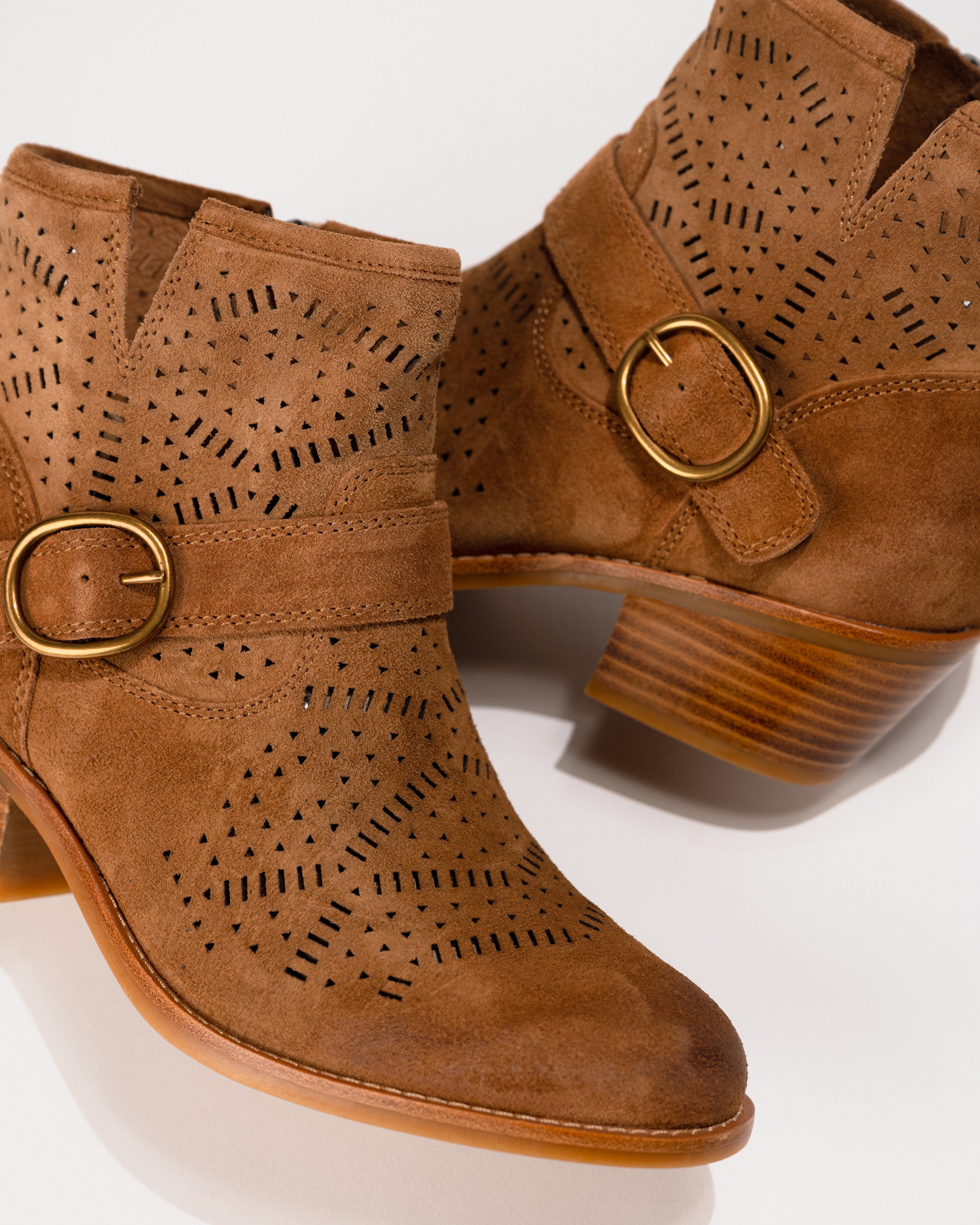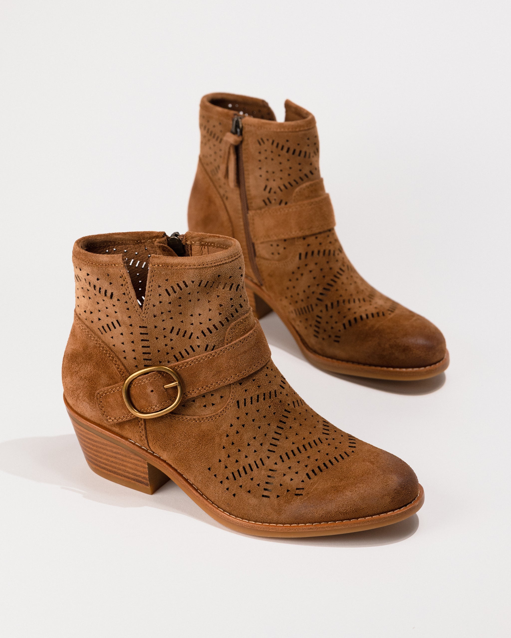 Crafted in soft Italian suede and detailed with a laser-cut shaft, side buckle, and stacked heel, the Adriana balances rustic charm with refined finishes. The cushioned leather-lined footbed features built-in arch support for all-day wear, while a side zipper offers easy on-and-off access. Whether you're strolling city streets or heading to a weekend market, these ankle boots move with you in comfort and style.