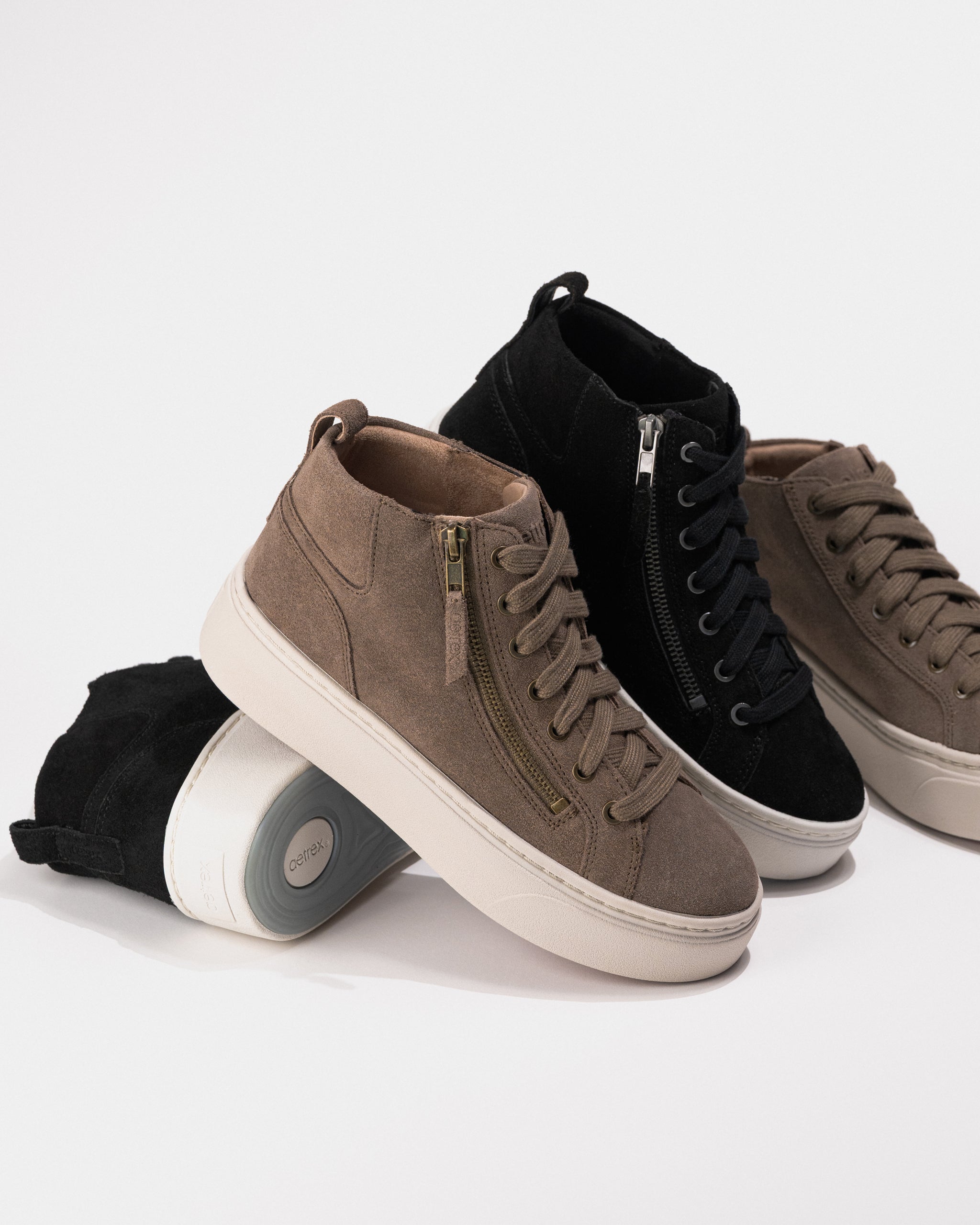 Designed for next-level support, the Gianna by Aetrex combines modern platform styling with comfort-driven technology. Crafted from soft black leather, this high-top sneaker features a functional side zipper, padded heel collar, and thick UltraSky™ cushioning. Aetrex’s Cobra Orthotic Technology and arch support system help relieve heel pressure and align your body from the ground up. Fashion-forward yet foot-friendly, the Gianna is ideal for long days, errand runs, or travel-ready comfort.